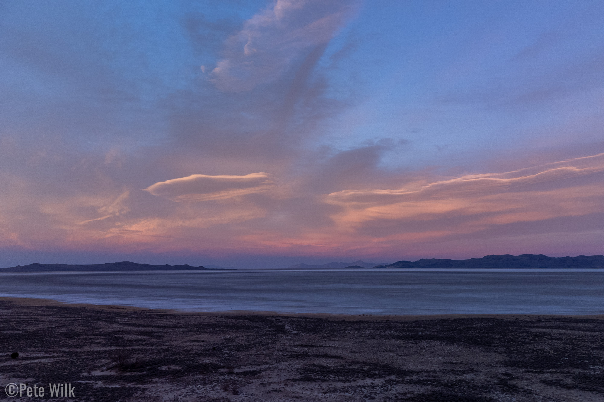 After climbing we looped back toward Wendover, then turned north for the long approach to Sun Tunnels. My planned shortcut—the most direct road I could piece together on Gaia—very nearly got us stuck in the playa. About halfway down it the van abruptly started losing speed. We were sinking into the unbelievably slick mud (which looked completely dry) and the spinning tires were throwing it onto the windows. Luckily I arced right onto slightly firmer ground and we were able to keep moving long enough to retreat without fully stopping. I’m pretty sure that if we had stopped, we would have been stuck.