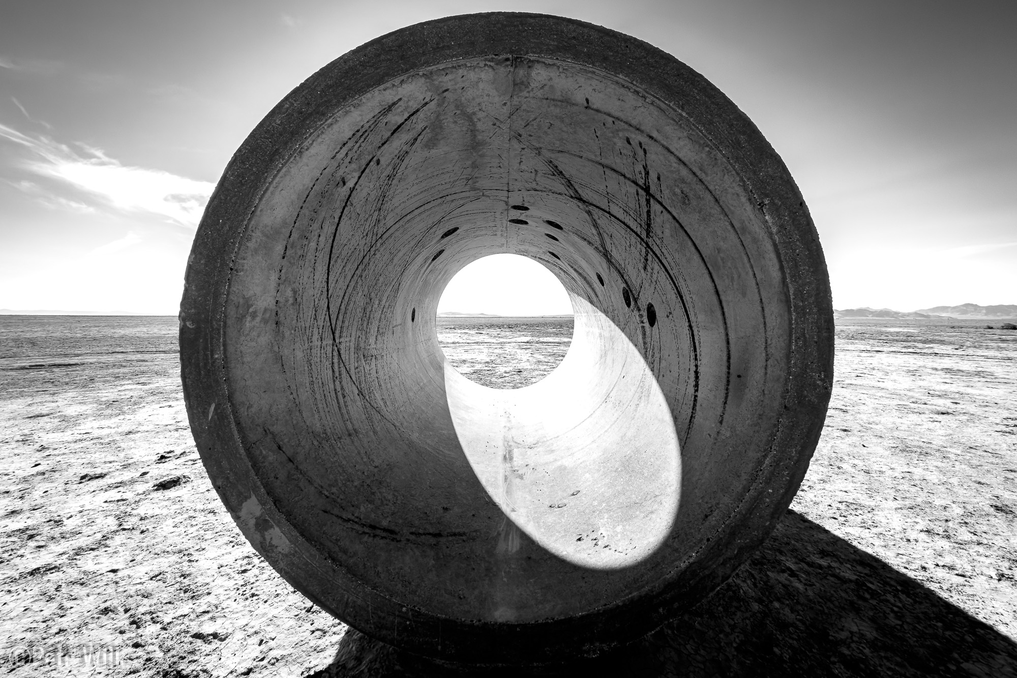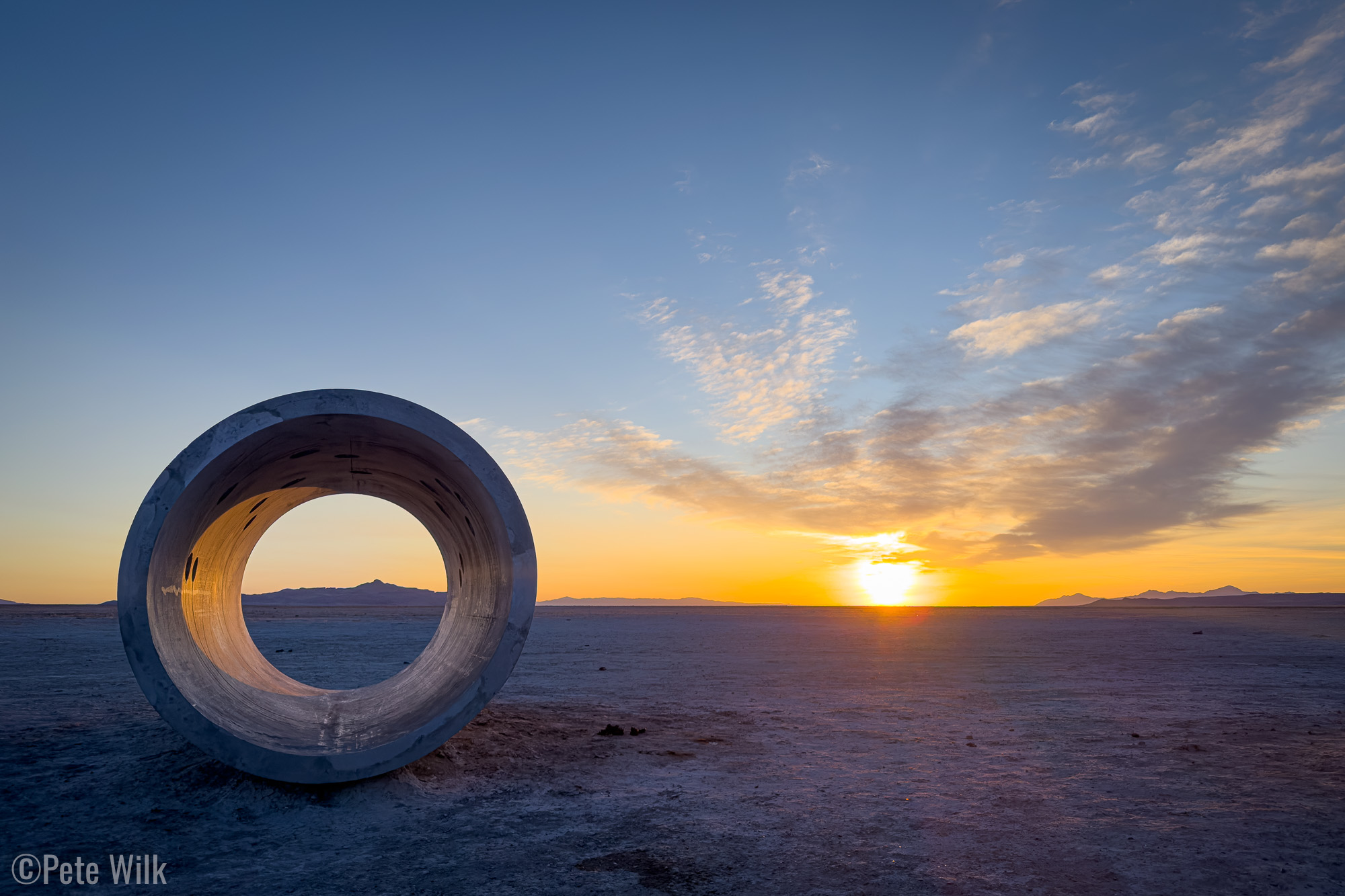 Sun Tunnels, by Nancy Holt, consists of four massive concrete cylinders set in an X-shaped arrangement in the Great Basin Desert. The tunnels are aligned so that the sun rises and sets through opposing pairs during the summer and winter solstices. The perforations in the tunnels correspond to constellations, projecting spots of light inside when the sun is high enough. Even though March is the literal midpoint between the solstices, it still made for a beautiful time to visit. We lucked out with mostly clear skies and an unobstructed horizon to the east.